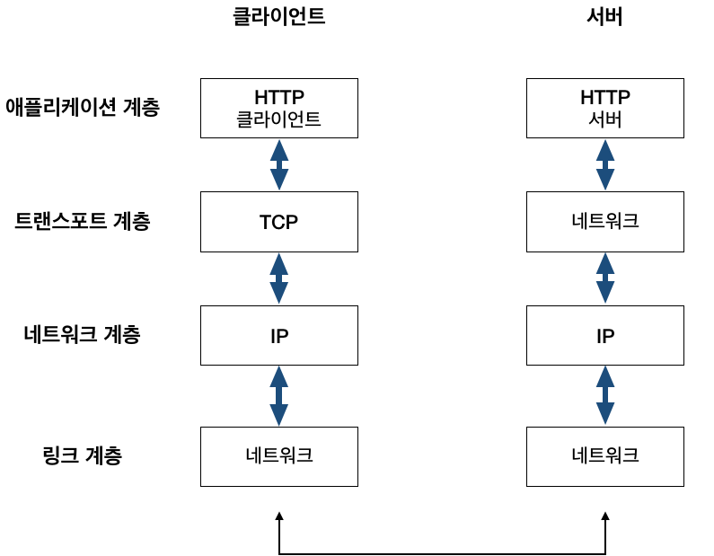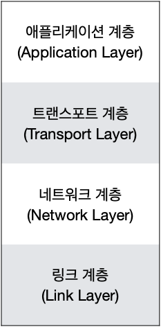 TCP/IP 프로토콜을 사용하는데 초점을 맞추고 있으며, 네트워크 엑세스 계층(1계층), 인터넷 계층(2계층), 전송 계층(3계층), 응용 계층(4계층)으로 나뉜다.
