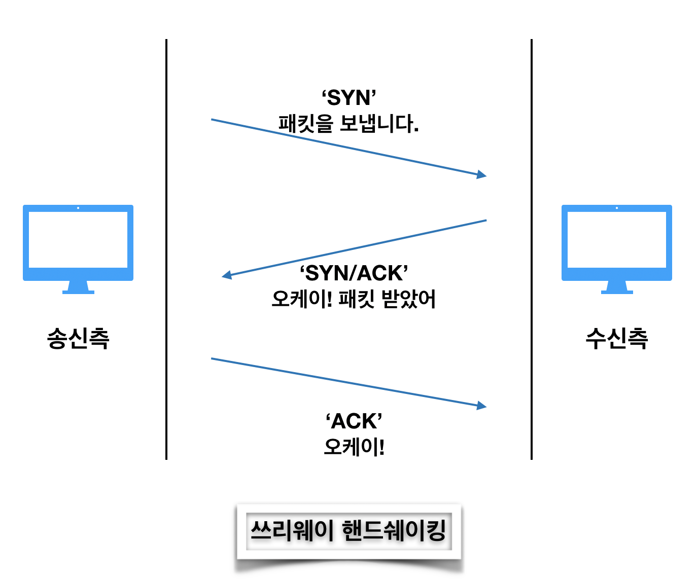 TCP는 데이터를 상대방에게 확실하게 보내기 위해서 쓰리웨이 핸드쉐이킹이라는 방법을 사용하고 있다. 이 방법은 패킷을 보내고 잘 보내졌는지 여부를 상대에게 확인하러 간다 여기에서 'SYN'와 'ACK'라는 TCP 플래그를 사용한다. 그림을 보면서 알아보자.