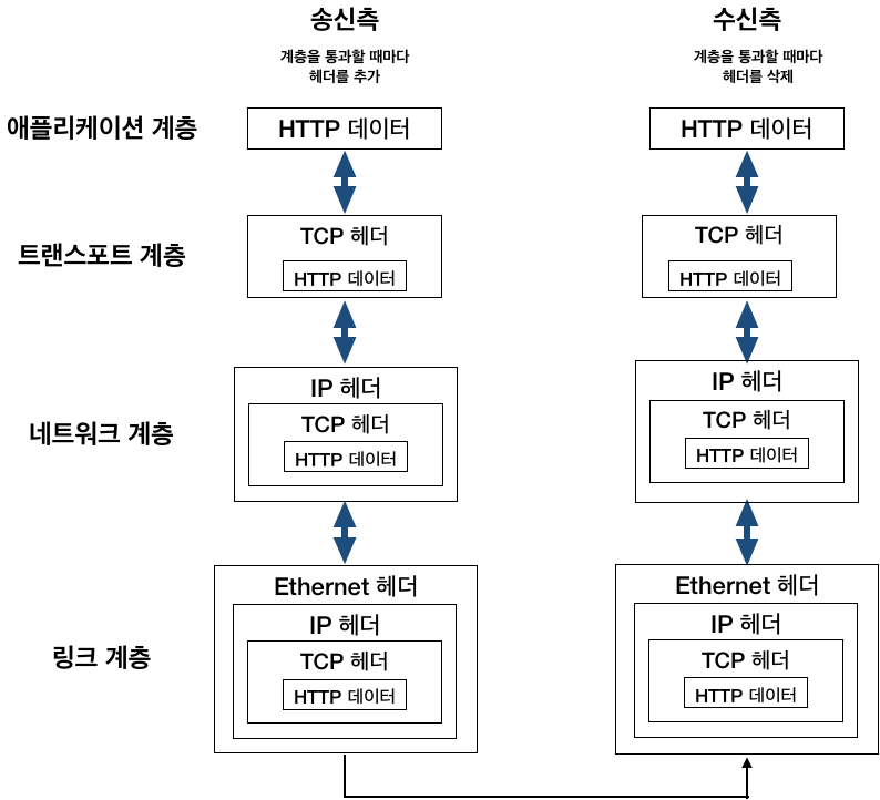 4. 수신측 서버는 링크 계층에서 데이터를 받아들여 순서대로 위의 계층에 전달하여 애플리케이션 계층까지 도달한다.