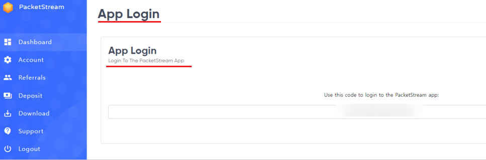 4. 작업표시줄에 아래와 같이 packetstream 항목이 생성되는데 우클릭 후 login 을 눌러준 뒤 Dashboard 에 있는 항목 코드를 옮겨서 붙여넣어주기