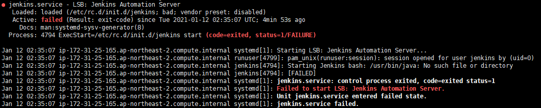 다음과 같은 Error로인해 Jenkins 구동에 실패했다는 내용이었다. 이유는 즉 자바가 설치가 안되어있었다.