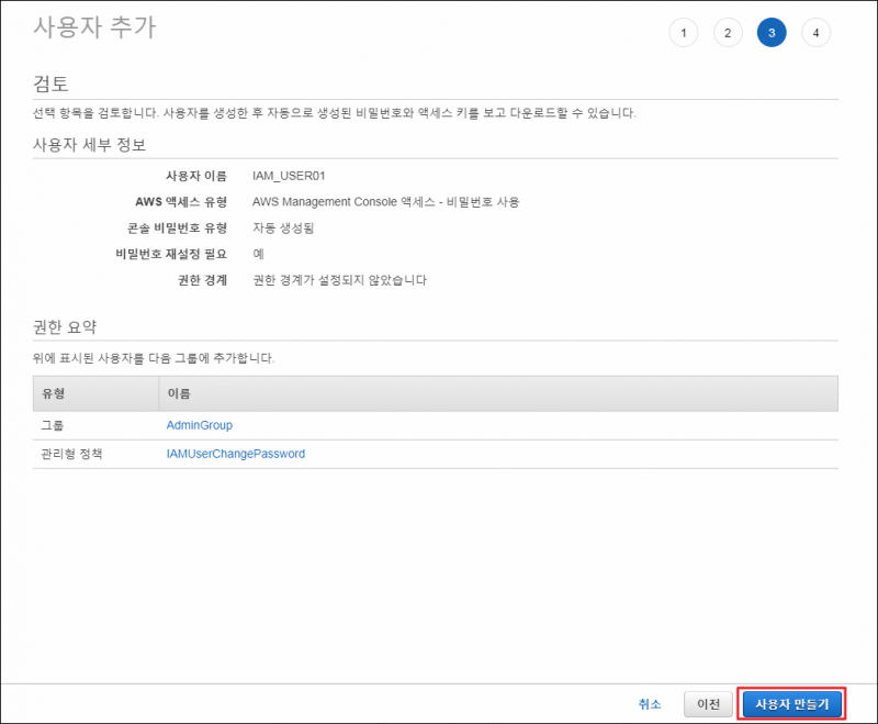 8. 사용자 세부 정보와 그룹이름을 확인하고 [사용자 만들기]를 클릭합니다.
