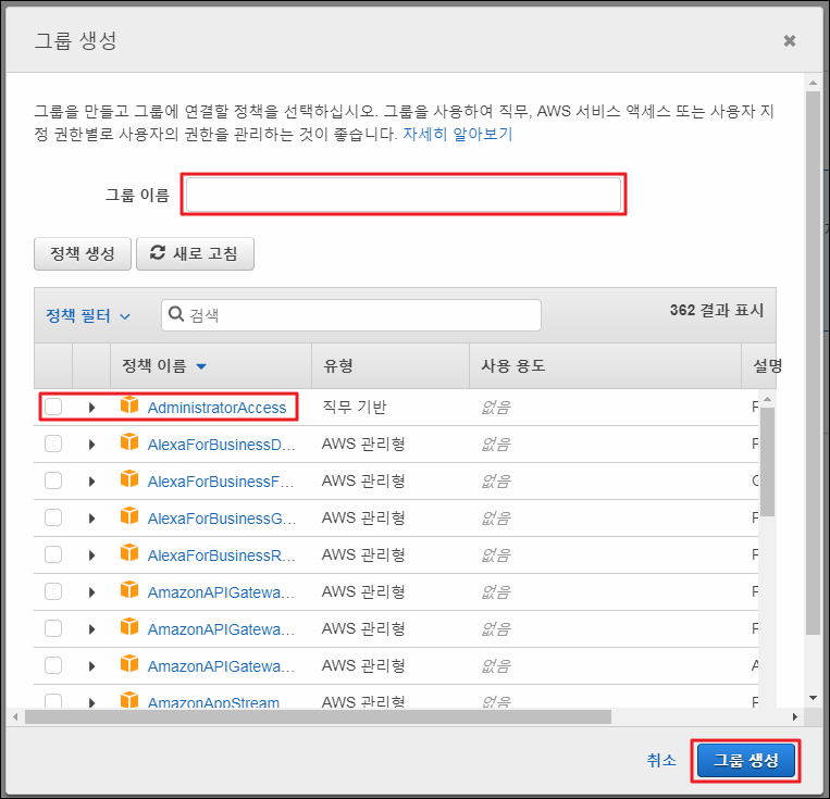 6. 그룹 이름을 만들고 ‘AdministratorAccess’를 체크합니다. 관리자 권한을 해당 그룹에 부여하는 것입니다. [그룹 생성]을 클릭합니다.