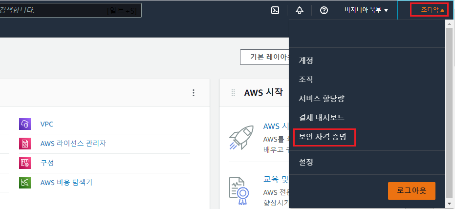 1. 내 계정을 클릭한 뒤 드롭다운에서 [내 보안 자격 증명]을 클릭합니다.