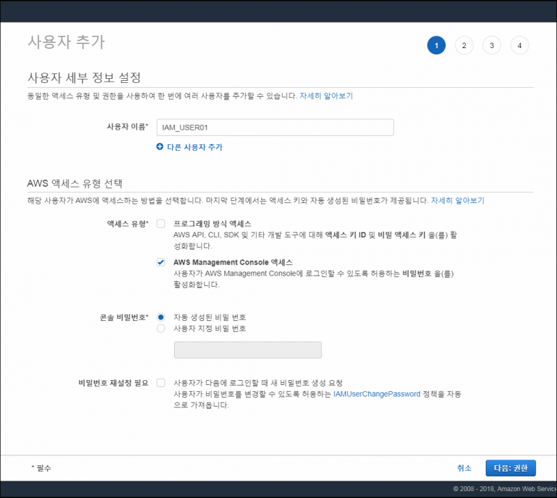 액세스 유형은 AWS Management Console 액세스, 콘솔 비밀번호는 자동 생성되도록 체크하고 [다음]을 클릭합니다.