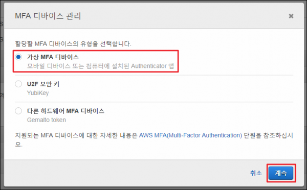 13. 가상 MFA 디바이스를 체크하고 [계속]을 클릭합니다.