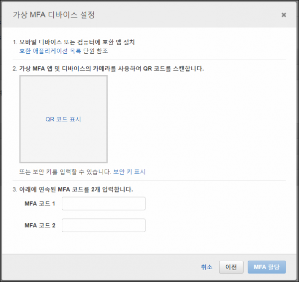 14. 스마트폰에서 [Google OTP]를 설치하고 [바코드 스캔]을 이용하여 QR코드를 스캔하면 MFA 코드가 생성됩니다. 연속된 MFA코드 2개를 입력하고 [MFA 할당]을 클릭합니다.