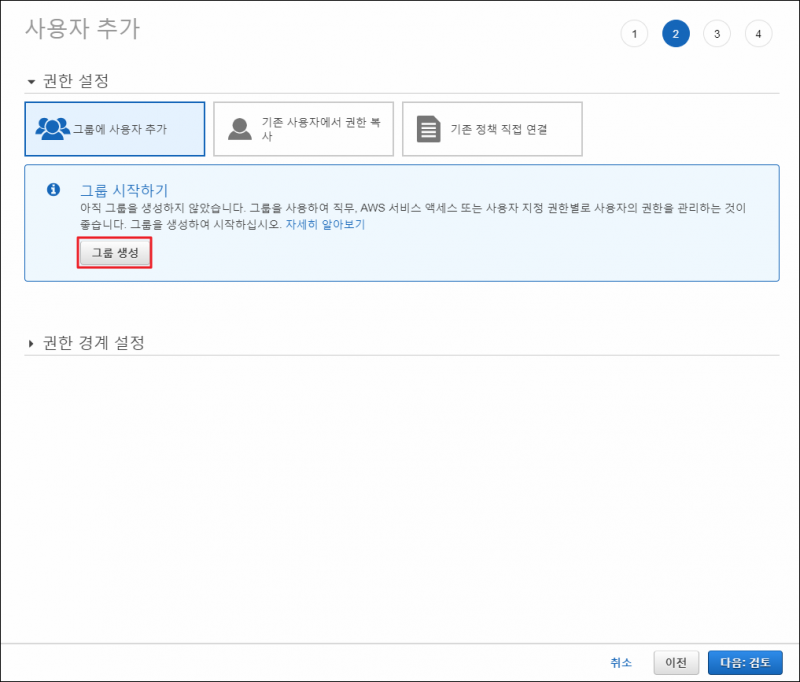 5. 권한 설정에서 그룹을 생성할 수 있습니다. 그룹에 권한을 설정하고 유저를 추가하면, 일괄적으로 관리할 수 있어 편리합니다. 유저에게서 권한을 제거하고 싶을 때는 그룹에서 사용자를 제거하면 됩니다. [그룹 생성]을 클릭합니다.