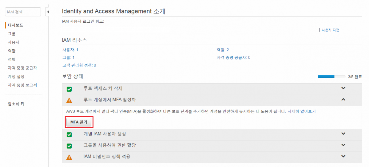 11. IAM 콘솔에 접속합니다. 대시보드에서 [루트 계정에서 MFA 활성화] -> [MFA 관리]를 클릭합니다.