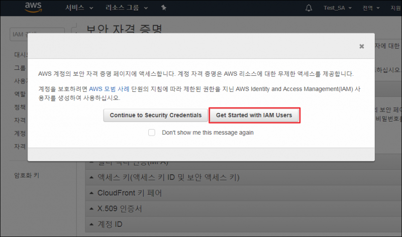 2. 다음의 팝업창이 나타납니다. [Get started with IAM Users]를 클릭합니다.
