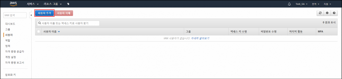 또는 AWS Management 콘솔에서 [서비스] -> [IAM]으로 접속합니다.