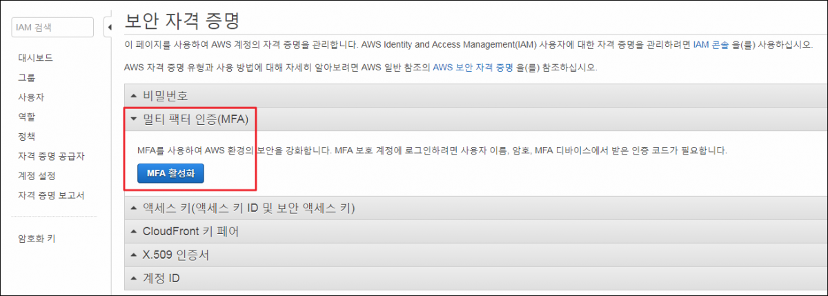 12. [멀티 팩터 인증(MFA)] -> [MFA 활성화]를 클릭합니다.