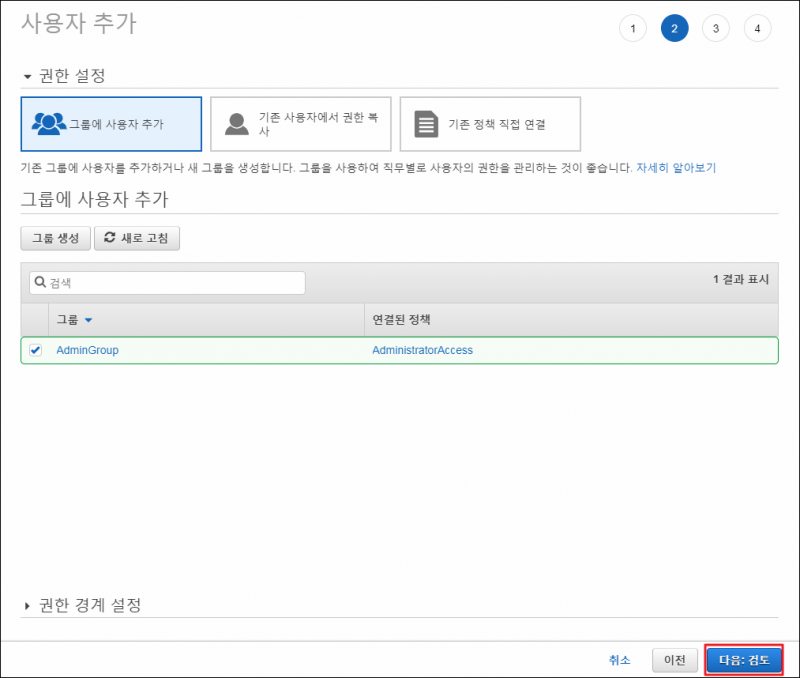 7. 이제 생성된 관리자 그룹에 사용자를 추가하겠습니다. [다음: 검토]를 클릭합니다.