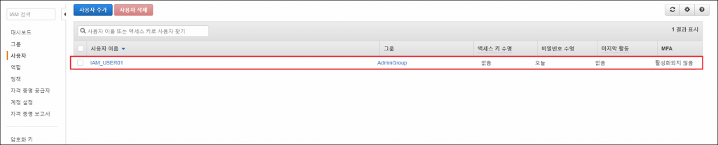 10. IAM_USER01 사용자가 생성된 것을 볼 수 있습니다. 앞으로는 이 IAM 유저로 로그인하여 네트워크를 구성할 수 있고, 루트 계정은 안전하게 보관할 수 있습니다.