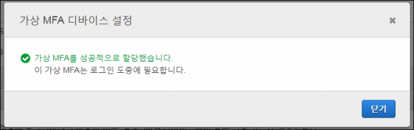 15. 위와 같은 창이 생기면 성공적으로 MFA가 할당된 것입니다. 이제 루트 계정으로 로그인을 할 때는 MFA 인증을 추가로 거쳐야만 로그인할 수 있습니다.