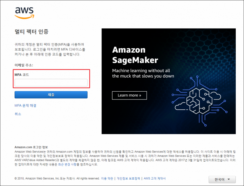 16. 루트 계정으로 로그인 시 MFA 코드를 입력하라는 화면이 뜹니다. Google OTP에서 해당 MFA 코드를 입력하면 로그인할 수 있습니다.