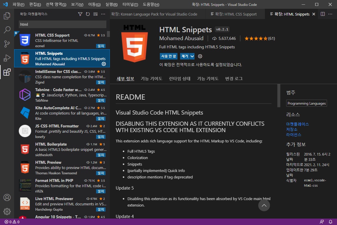 1) HTML Snippets (자동완성)