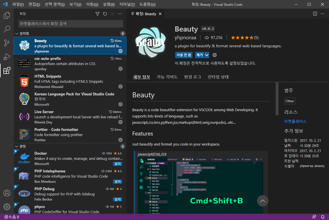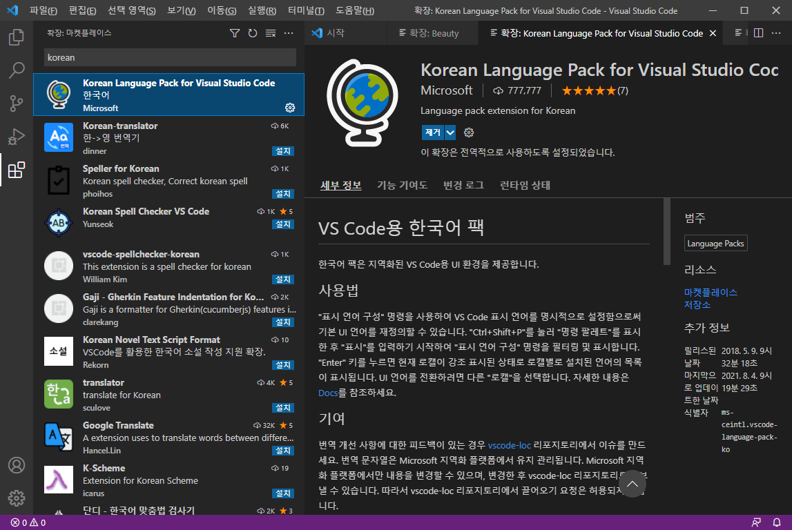 2) Korean Language Pack for Visual Studio Code (한국어 기능)