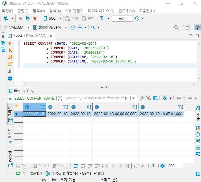 날짜 형식을 문자를 CONVERT 함수에 넣으면 날짜포맷을 인식하고 날짜(Date)형으로 값을 리턴한다.