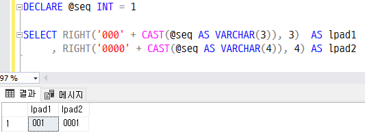 SELECT RIGHT('000' + CAST(@seq AS VARCHAR(3)), 3) AS lpad1