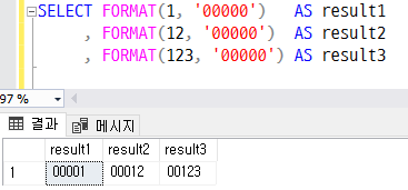 , RIGHT('00000' + CAST(123 AS VARCHAR), 5) AS result3