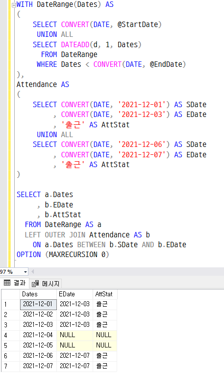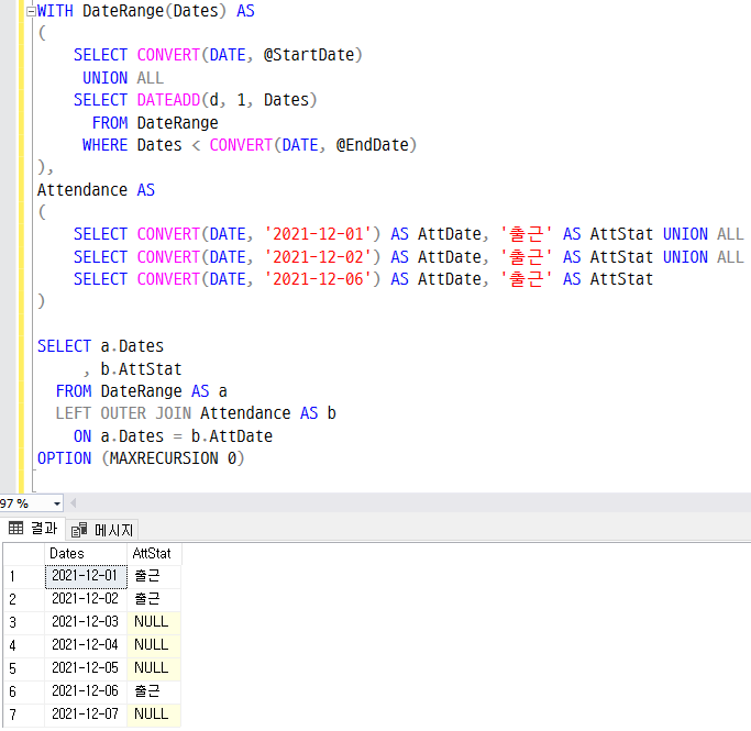 재귀 쿼리를 사용하여 12.01~12.07까지 날짜를 가진 가상 테이블(DateRange)을 만들 수 있다. 차후 이 가상 테이블과 실제 테이블을 아우터 조인하여 테이블에 존재하지 않는 날짜까지 조회를 할 수 있다.