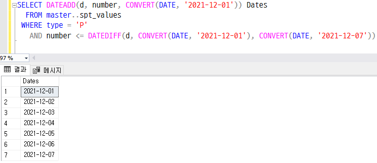 WHERE Dates < CONVERT(DATE, '2021-12-07') --종료일자