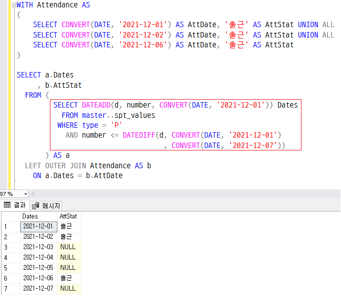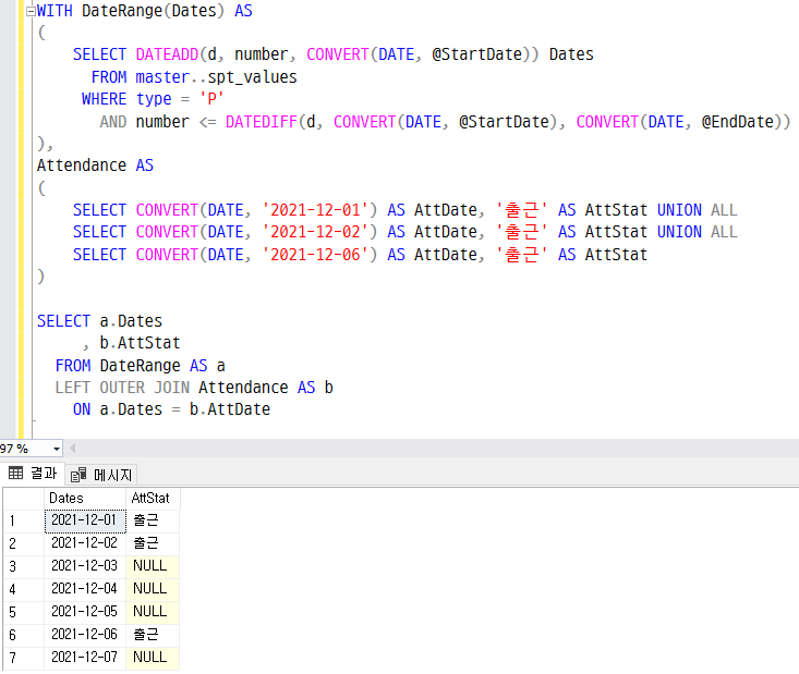 SELECT CONVERT(DATE, '2021-12-06') AS AttDate, '출근' AS AttStat