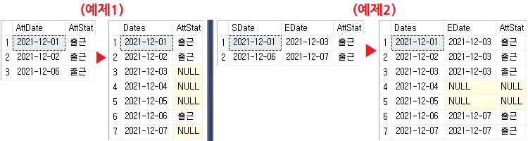 SELECT CONVERT(DATE, '2021-12-01') AS AttDate, '출근' AS AttStat UNION ALL