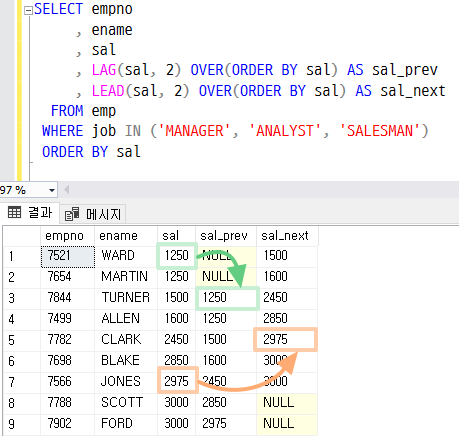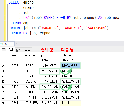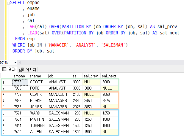 PARTITION BY 절을 사용하면 해당 그룹 내부에서 이전 행 및 다음 행의 값을 가져올 수 있다. 그룹(JOB)이 바뀌면 값을 참조하지 못하므로 NULL로 표시된다.