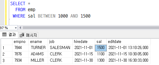 BETWEEN 연산자 대신 부등호를 사용해도 동일한 결과가 조회된다. 부등호의 이점은 같거나 크다(>=), 같거나 작다(<=) 또는 작다(>), 크다(<) 등 조금 더 다양한 범위 조건을 부여할 수 있다.