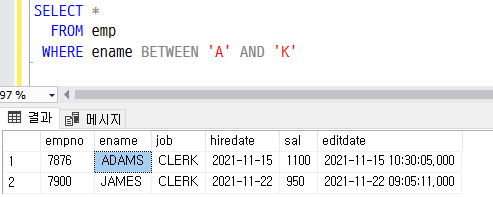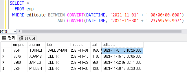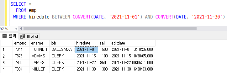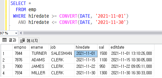입사일(hiredate)을 2021.11.01부터 2021.11.30일 까지 조회한 결과이다.