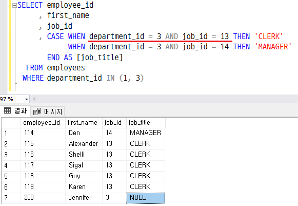 , CASE WHEN department_id = 3 AND job_id = 13 THEN 'CLERK'