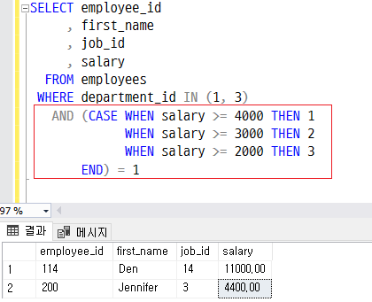 WHERE 절에도 CASE 표현식을 사용할 수 있다. 인덱스 컬럼에 CASE 표현식 사용하면 쿼리 문의 속도에 영향을 미치므로 주의해야 한다. 단순 필터링 용도로만 사용해야 한다.