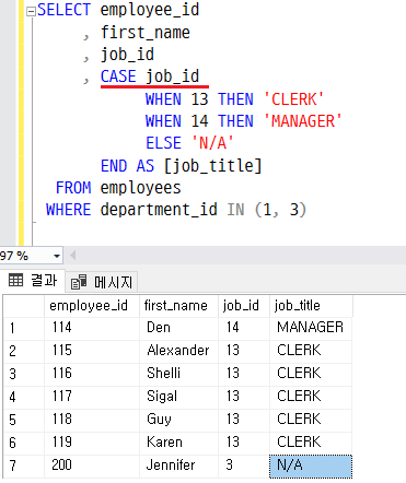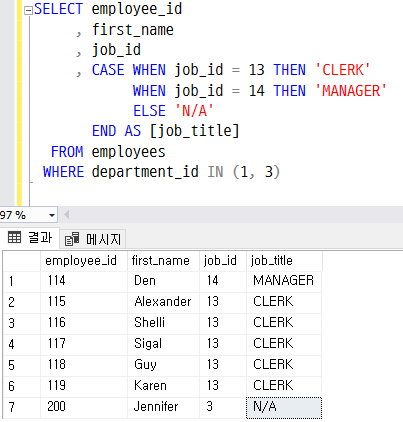 , CASE WHEN department_id = 3 AND job_id = 13 THEN 'CLERK'