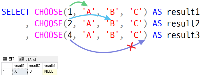 SELECT CHOOSE(1, 'A', 'B', 'C') AS result1