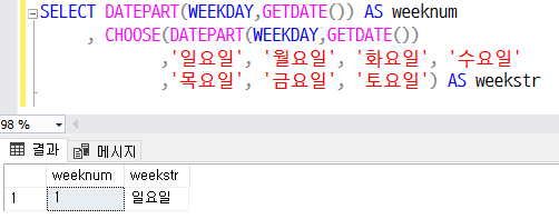 요일 반환(숫자) : DADATEPART(WEEKDAY, GETDATE())
