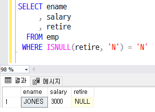 WHERE절에서 NULL 값의 컬럼을 조회하기 위해서는 "컬럼 IS NULL" 또는 "ISNULL(컬럼, '대체값') = '대체값'"으로 조회 한다.