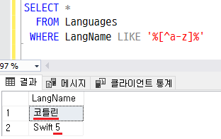 WHERE LangName LIKE '%[가-힣]%'