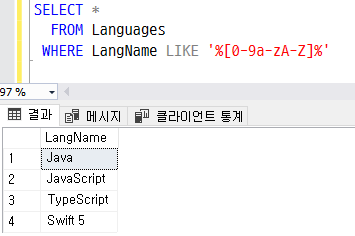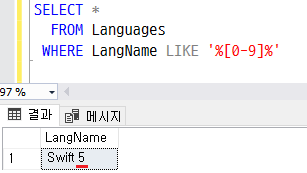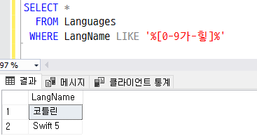 WHERE LangName LIKE '%[0-9가-힣]%'