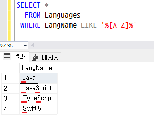 WHERE LangName LIKE '%[A-Z]%'