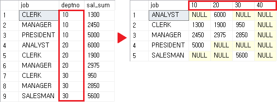 근무지코드(10, 20, 30...)를 피벗 대상 컬럼으로 지정하면 조회된 데이터에 없는 근무지 코드도 출력되기 때문에, 존재하는 근무지코드만 출력하기 위해서는 동적쿼리문을 사용해야 한다.