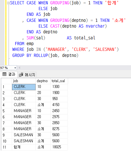 SELECT CASE WHEN GROUPING(job) = 1 THEN '합계'