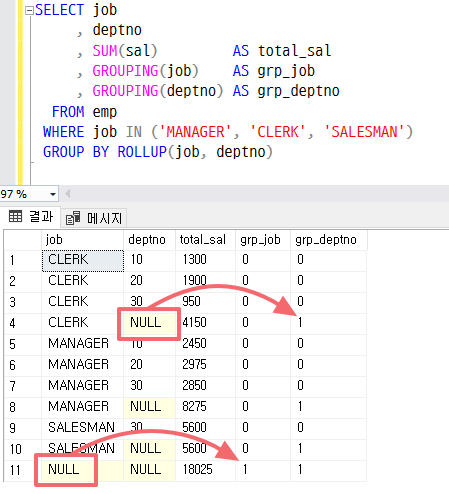 HAVING GROUPING(job) = 1 OR GROUPING(deptno) = 0