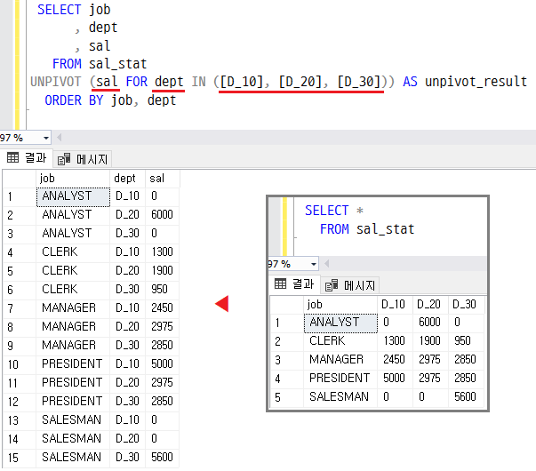 UNPIVOT (sal FOR dept IN ([D_10], [D_20], [D_30])) AS unpivot_result
