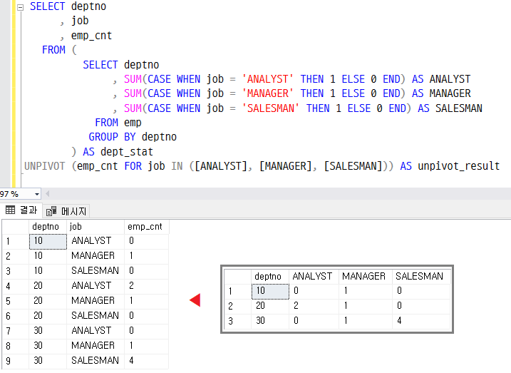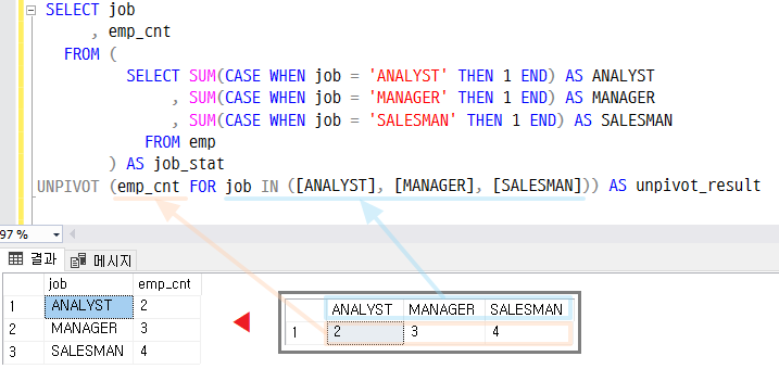 서브 쿼리의 별칭(AS job_stat)과 UNPIVOT의 별칭(AS unpivot_result)는 꼭 지정해야 오류가 발생하지 않는다.