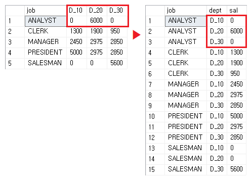 부서코드(deptno), 직군(job)로 집계된 결과를 UNPIVOT 한 예제이다.