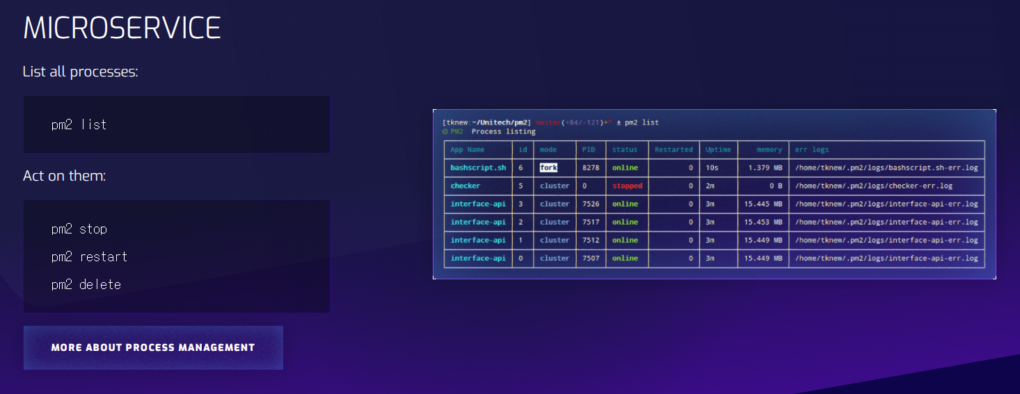 Advanced process manager for production Node.js applications. Load balancer, logs facility, startup script, micro service management, at a glance.