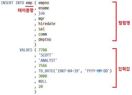 VALUES (7788, 'SCOTT', 'ANALYST', 7566, '1987-04-19', 3000, NULL, 20)