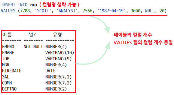 INTO 절의 컬럼 개수와 데이터 타입이 VALUES 절의 컬럼 개수와 데이터 타입이 동일해야 한다. VALUES 절에 테이블의 모든 컬럼이 나열되어 있다면, INTO 절의 컬럼을 생략할 수 있지만, INTO 절에 입력할 컬럼을 모두 나열하는 방식을 권장한다.